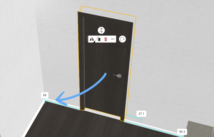 Comece no modo 2D delineando as paredes, janelas e portas. Pense nisso como preparar a tela antes de adicionar suas ideias de design. Dica rápida: é surpreendentemente fácil esquecer como portas e janelas abrem. No Roomtodo, você pode ajustar a direção do balanço nas configurações do objeto e, em seguida, verificar no modo de passeio 3D para ter certeza de que nada bloqueia o movimento. Por exemplo, uma porta de banheiro que abre para dentro pode bater na pia se você a colocar muito perto — modificar o balanço evita surpresas. Preste atenção a esses pequenos detalhes, e você evitará muita frustração mais tarde.