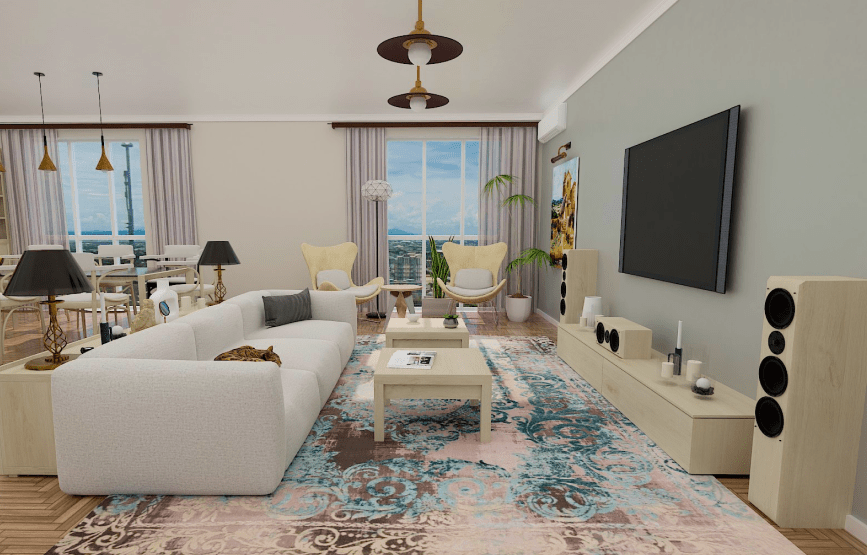 Finalmente, lembre-se de que um bom design é sobre camadas e equilíbrio. Comece com o essencial, e depois adicione decoração para trazer calor e personalidade. Plantas, tapetes e pinturas podem mudar completamente a atmosfera de um cômodo. E se você estiver indeciso, guarde múltiplas versões do seu design — você pode achar que o segundo ou terceiro layout funciona melhor..