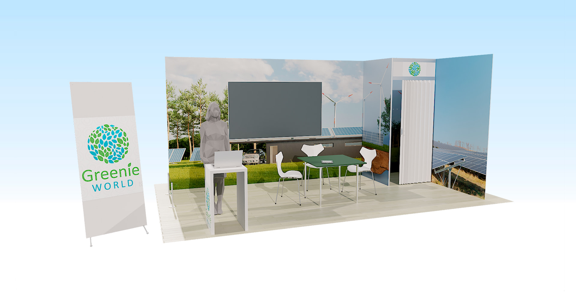 дизайну стенда 20x20, ви отримуєте місце для виділених зон: зони привітання, приватного простору для зустрічей і стійки для демонстрації продуктів. Ці розміри ідеально підходять для демонстрації складніших історій та інтерактивного досвіду. З Румтуду ви можете розробити кілька конфігурацій для вашого
